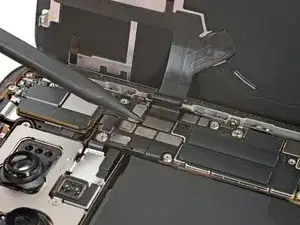 Используйте отвертку P2 с головкой-пенталоб для удаления двух винтов длиной 7,4 мм по обе стороны от порта зарядки.