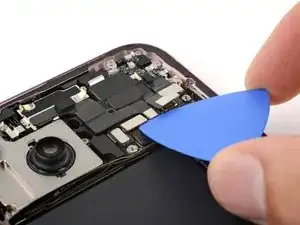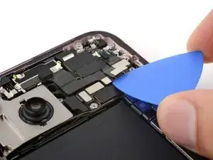 Используйте пинцет, чтобы сдвинуть крышку к верхней части телефона, чтобы отсоединить её от системной платы.