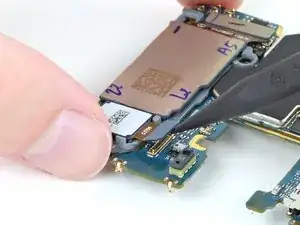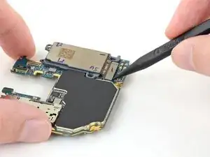 Держа экранную защиту материнской платы пинцетом в стороне, используйте заострённый конец лопатки, чтобы поддеть пресс-коннектор катушки беспроводной зарядки.