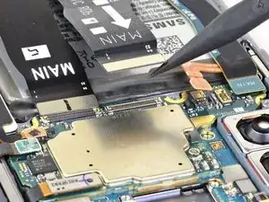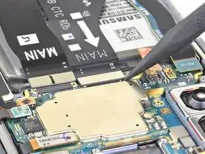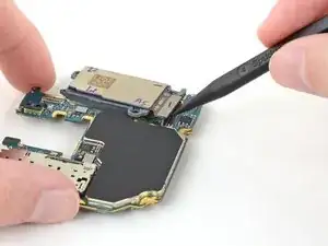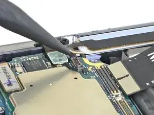 Держа экранную защиту материнской платы пинцетом в стороне, используйте заострённый конец лопатки, чтобы поддеть пресс-коннектор аккумулятора.