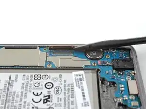 Потяните плату в направлении верхнего края телефона, слегка покачивая её. Это освободит разъём зарядного порта из гнезда.