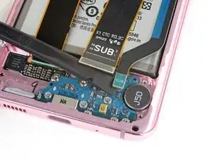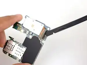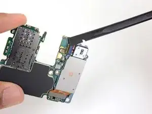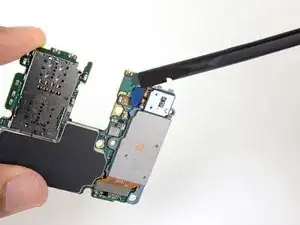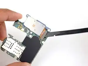 Вставьте плоский конец лопатки в нижний левый угол узла материнской платы и подденьте, чтобы освободить его от корпуса телефона.