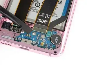 Используйте лопатку, чтобы поддеть и отключить гибкий кабель боковой кнопки от материнской платы.