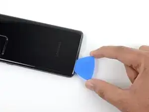 Сдвиньте медиатор в сторону нижнего края телефона, чтобы отделить клей задней крышки.