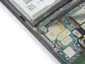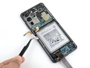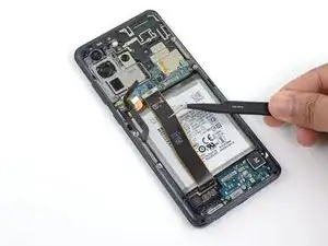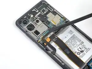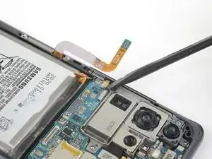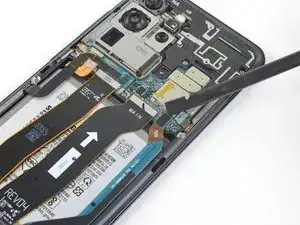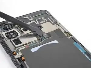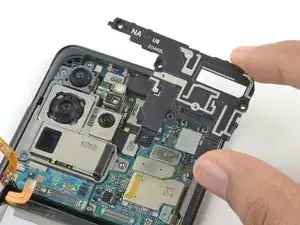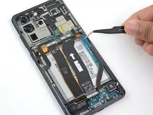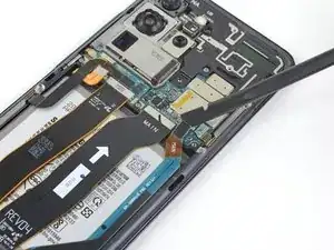 Осторожно отлейте и отогните гибкие кабели дисплея и левой 5G-антенны, чтобы они не мешали материнской плате и аккумулятору.