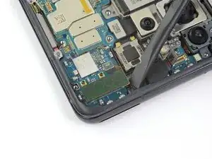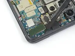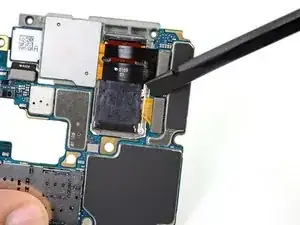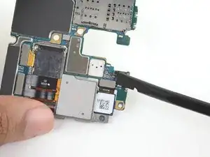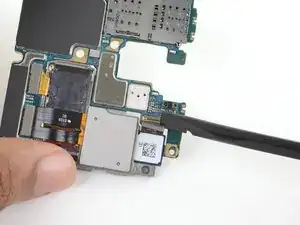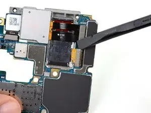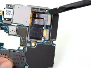 Вставьте наконечник лопатки в нижний левый угол узла материнской платы и подденьте, чтобы освободить его от корпуса телефона.