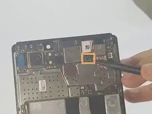 Отключите оранжевый плоский кабель аккумулятора, аккуратно приподняв его лопаткой.