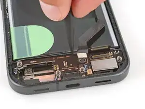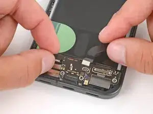 Держите межсоединительный кабель в стороны и потяните плату USB‑C к верхней части телефона, чтобы удалить ее.