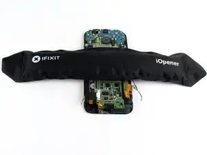 Используйте iOpener или тепловой пистолет, чтобы ослабить клей, фиксирующий материнскую плату к сборке дисплея.