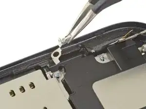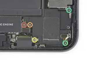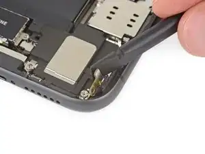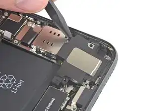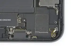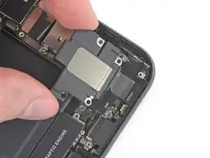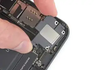 Приподнимите и отведите в сторону небольшую плату, закрывающую оставшийся винт динамика в правом нижнем углу iPhone.