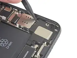 Воспользуйтесь пинцетом, чтобы приподнять и снять чёрную ленту и резиновую прокладку, закрывающие разъём Taptic Engine.