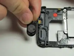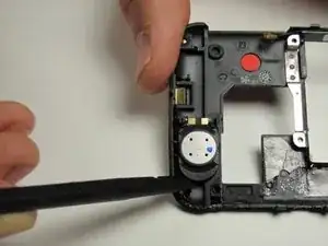 Используйте лопатку или инструмент для вскрытия корпуса, чтобы выдрать динамик, просунув инструмент в щель между двумя частями чёрного пластика.
