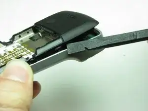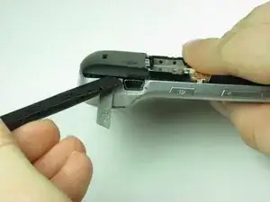 После того как лопатка окажется под пластиковой деталью, поворачивайте ее против часовой стрелки, используя мягкое вращательное движение, пока деталь не освободится от корпуса телефона.