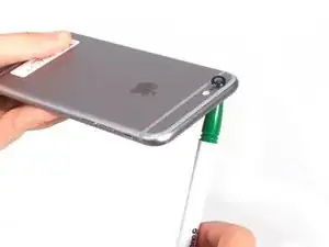 Используя пластиковый открывающий инструмент, аккуратно приподнимите задний корпус от сборки дисплея, продолжая тянуть вверх за присоску.