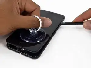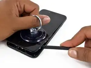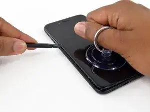 Потяните присоску, чтобы создать небольшой зазор между сборкой дисплея и задней крышкой.