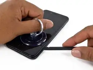Водонепроницаемый клей, удерживающий дисплей, очень прочный, и для создания начального зазора требуется значительное усилие. Если вам трудно открыть зазор, подергайте экран вверх‑вниз, чтобы ослабить клей, пока не сможете вставить лопатку.