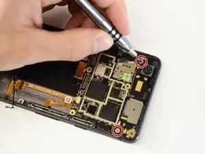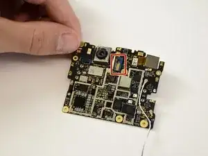 Переверните материнскую плату, чтобы получить доступ к разъёму ленточного кабеля линзы камеры.