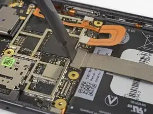 Используйте острый конец лопатки, чтобы приподнять разъём шлейфа дисплея и вынуть его из гнезда на материнской плате.