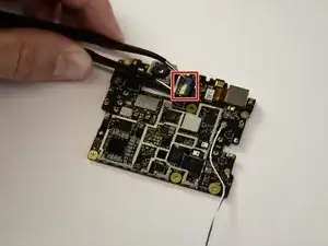 Снимите ленточный разъём, соединяющий линзу камеры с материнской платой, захватив его пинцетом и поднимая вверх.