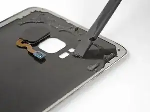 Вы можете повредить плёночный кабель датчика отпечатков пальцев, если вставите лопатку слишком глубоко на этом этапе. Работайте аккуратно и ориентируйтесь на схему в шаге 2.