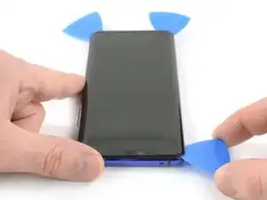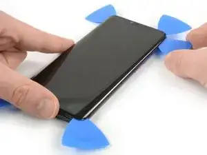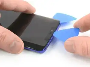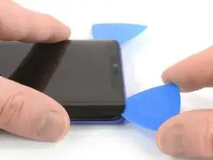 Вставьте вторую лопатку и проведите ею до левого нижнего угла телефона, чтобы разрезать клей.