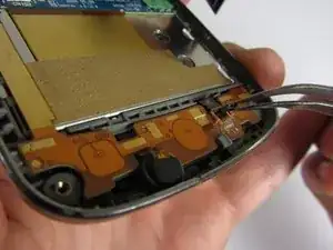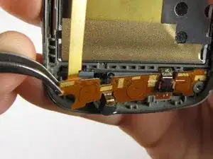 Одна из полос, которую вы вытащили из защёлки на предыдущем шаге, прикреплена к экрану внизу. Будьте осторожны, чтобы не повредить её при снятии экрана.