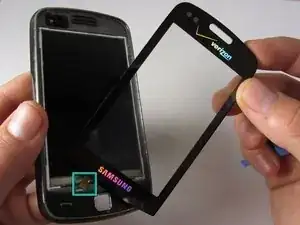 Начиная с верхней части, используйте пластиковый инструмент для вскрытия, чтобы приподнять защитный экран на передней панели телефона.