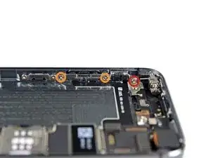 Снимите следующие винты, которые фиксируют скобы кнопок громкости и переключателя режима звонка на стороне задней панели: