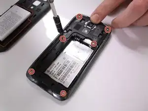 4 винта расположены по периметру телефона, 2 — вокруг клеммы батареи.