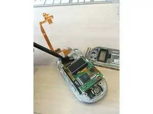 Пластиковым инструментом для вскрытия отделите внутреннее металлическое покрытие от печатной платы. Нажмите, чтобы снять деталь.