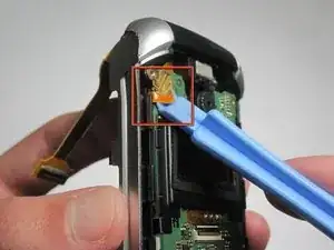 С помощью инструмента для вскрытия iPod отсоедините жёлтый гибкий кабель от зелёной печатной платы.
