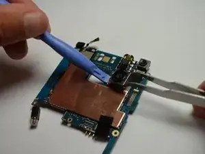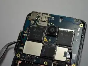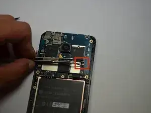 Осторожно снимите шлейф, который соединяет камеру с передним экраном, с помощью пинцета и пластикового инструмента для открытия.