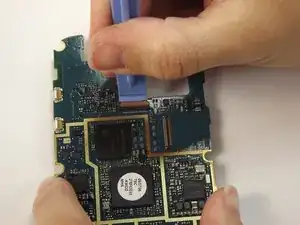 С помощью пластикового инструмента поднимите флап, соединенный с камерой (указан красным), чтобы удалить его.