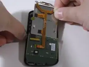 Поднимите плату кончиками пальцев и отложите её на бок телефона. Учтите, что две части соединены золотой и чёрной плёнкой.