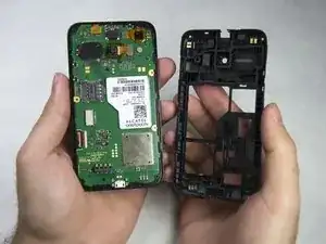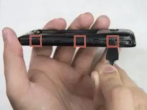 Вставьте пластиковую или металлическую лопатку между передней панелью и задней рамкой в одной из областей, отмеченных красными квадратиками, и аккуратно подденьте заднюю рамку. Повторяйте по кругу вокруг телефона, пока задняя рамка полностью не отойдёт.