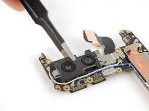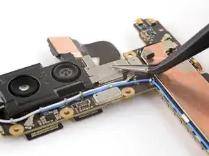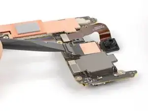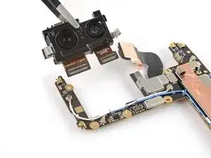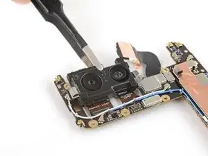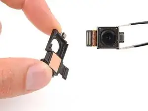 Используйте пинцет, чтобы аккуратно отлепить серебристую проводящую ткань, соединяющую кронштейн задней камеры с платой.