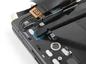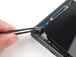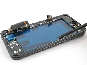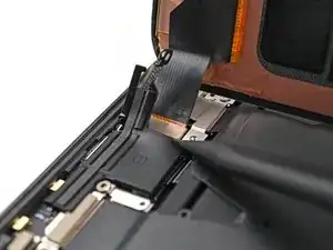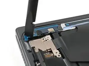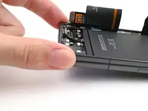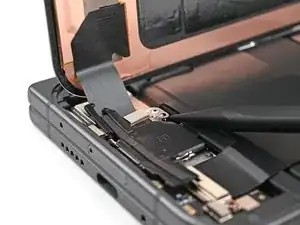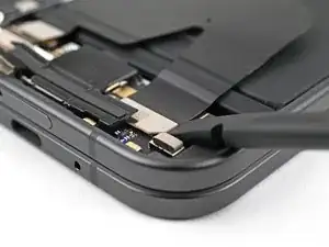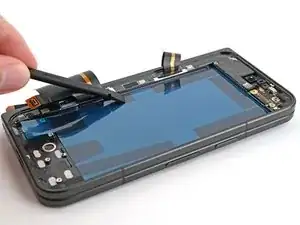 Используйте острый конец лопаточки, чтобы поддеть и отсоединить нажимной разъём шлейфа дисплея.
