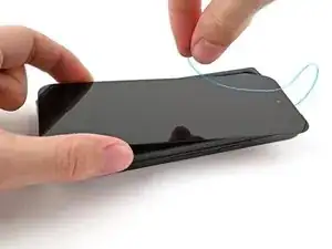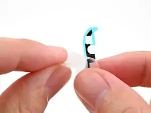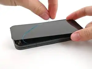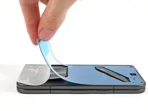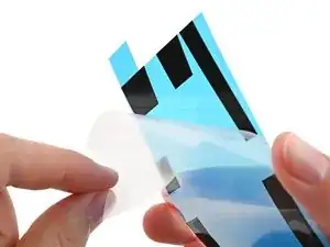Снимите синюю подложку с полосы клея внешнего экрана в нижнем левом углу.
