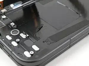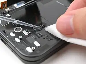 Используйте лопатку или пальцы, чтобы удалить старый клей для внешнего экрана в нижнем левом углу.