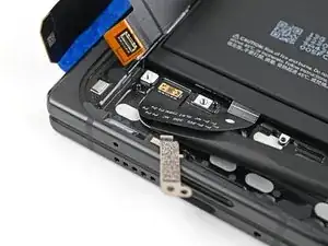 Используйте отвертку Torx Plus 3IP, чтобы выкрутить два винта длиной 2,2 мм, фиксирующие держатель нижнего кабеля межсоединения.