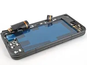 Используйте фен или термофен, чтобы нагреть участок внутреннего экрана за питающей петлёй аккумулятора (сторона с вырезом для SIM-карты) до состояния, когда он будет едва слишком горячим для касания.