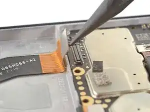 Используйте заострённый наконечник медиатора, чтобы поддеть и отсоединить защёлкивающийся разъём кабеля дисплея.