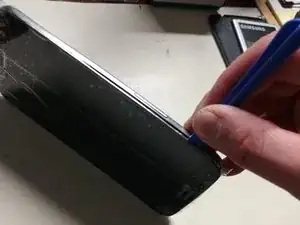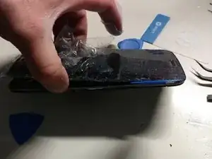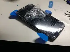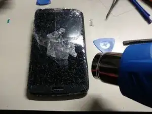 С помощью фенa для нагрева аккуратно прогрейте экран, одновременно используя лопатки, чтобы обходить устройство и ослаблять клей.