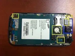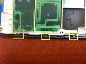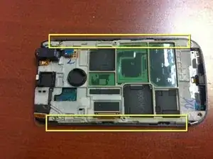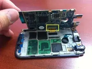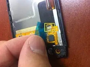 Жёлтым прямоугольником отмечена плата микрофона. Её следует снять для замены дигитайзера. Есть пара маленьких защёлок, которые нужно отогнуть от платы, и эта деталь легко выскакивает.