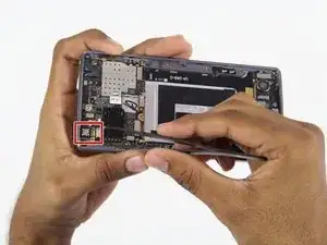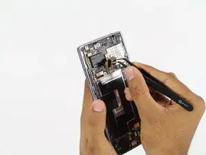 Когда аккумулятор ослабнет от клеевой фиксации, с помощью лопатки отсоедините разъем аккумулятора от телефона в верхней правой части.