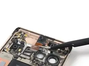 Используйте пинцет, чтобы снять пружину в верхнем левом углу модуля задней камеры.