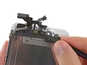 Поддерживая переднюю панель, используйте ноготь или кромку монтажного инструмента, чтобы отсоединить разъем кабеля фронтальной камеры и динамика-слухового приёмника.