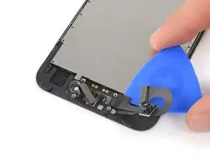 Сдвиньте медиатор в направлении корпуса фронтальной камеры, отделяя клей, удерживающий кабель на передней панели. Остановитесь прямо перед стойками для винтов.