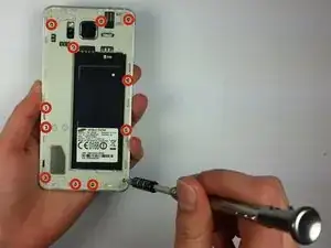 Используйте отвертку JIS #000, чтобы выкрутить все двенадцать 3 мм винтов, окружающих заднюю часть телефона.