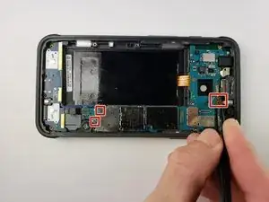 Используйте металлическую лопатку, чтобы оторвать среднюю рамку и батарею от материнской платы.